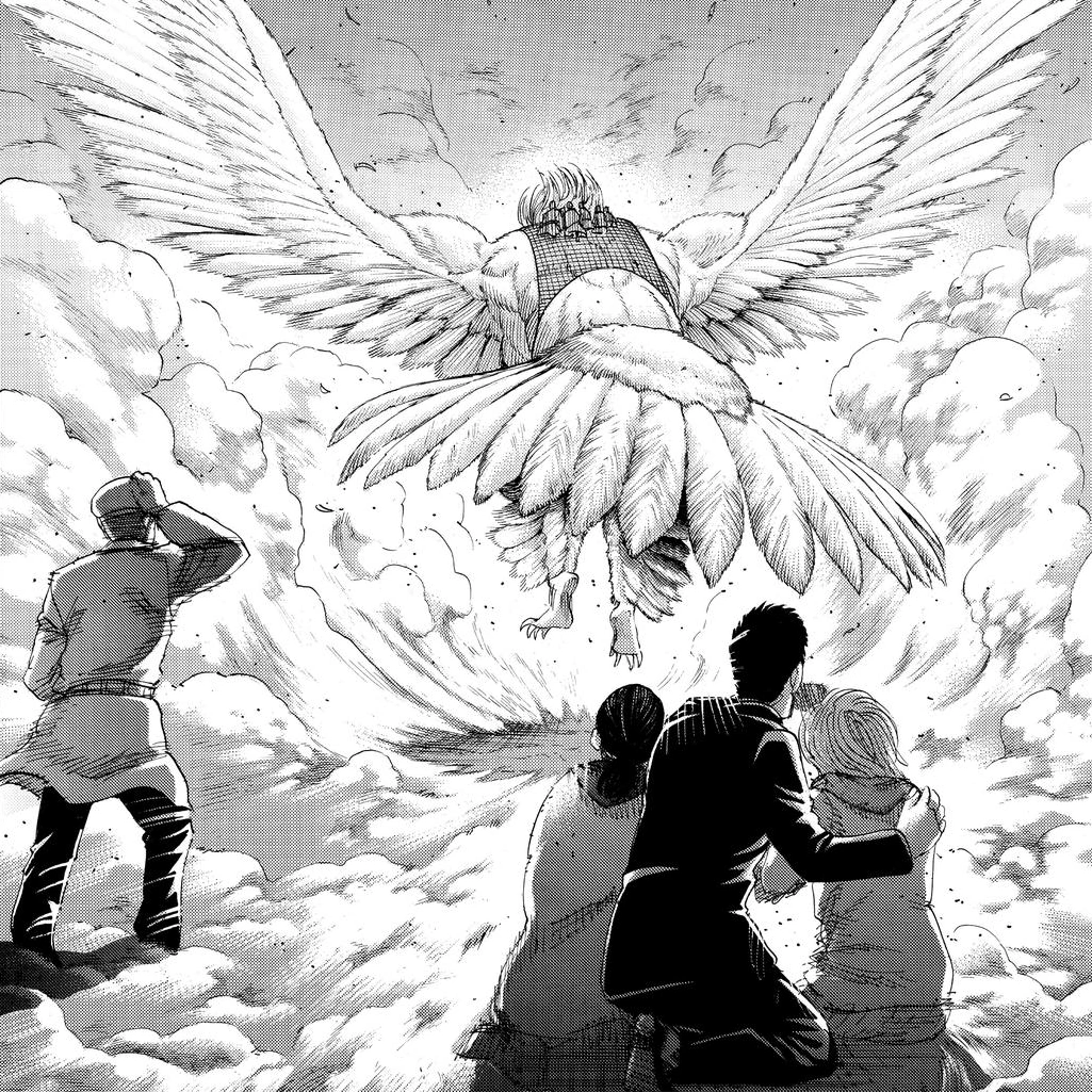 Cuando emprenden vuelo Falco lanza un grito que parece ser de desesperación e impotencia y que, parece activar inconscientemente la transformación de Eldianos en titanes. Jean y Connie se abrazan considerando sus últimos momentos, hablando acerca de las decisiones que tomaron cuando eran reclutas; fue lo mejor que pudieron hacer y llegaron a salvar al mundo, pero ahora se preparan para lo peor, mientras que Annie sale volando por la repentina transformación de su padre. Armin y Eren se baten en duelo en sus formas titánicas, mientras que Reiner, Pieck y Annie pelean contra el ciempiés y los titanes puros. Se puede ver en medio de la batalla a Jean, Connie, Gabi y Karina transformados ya.