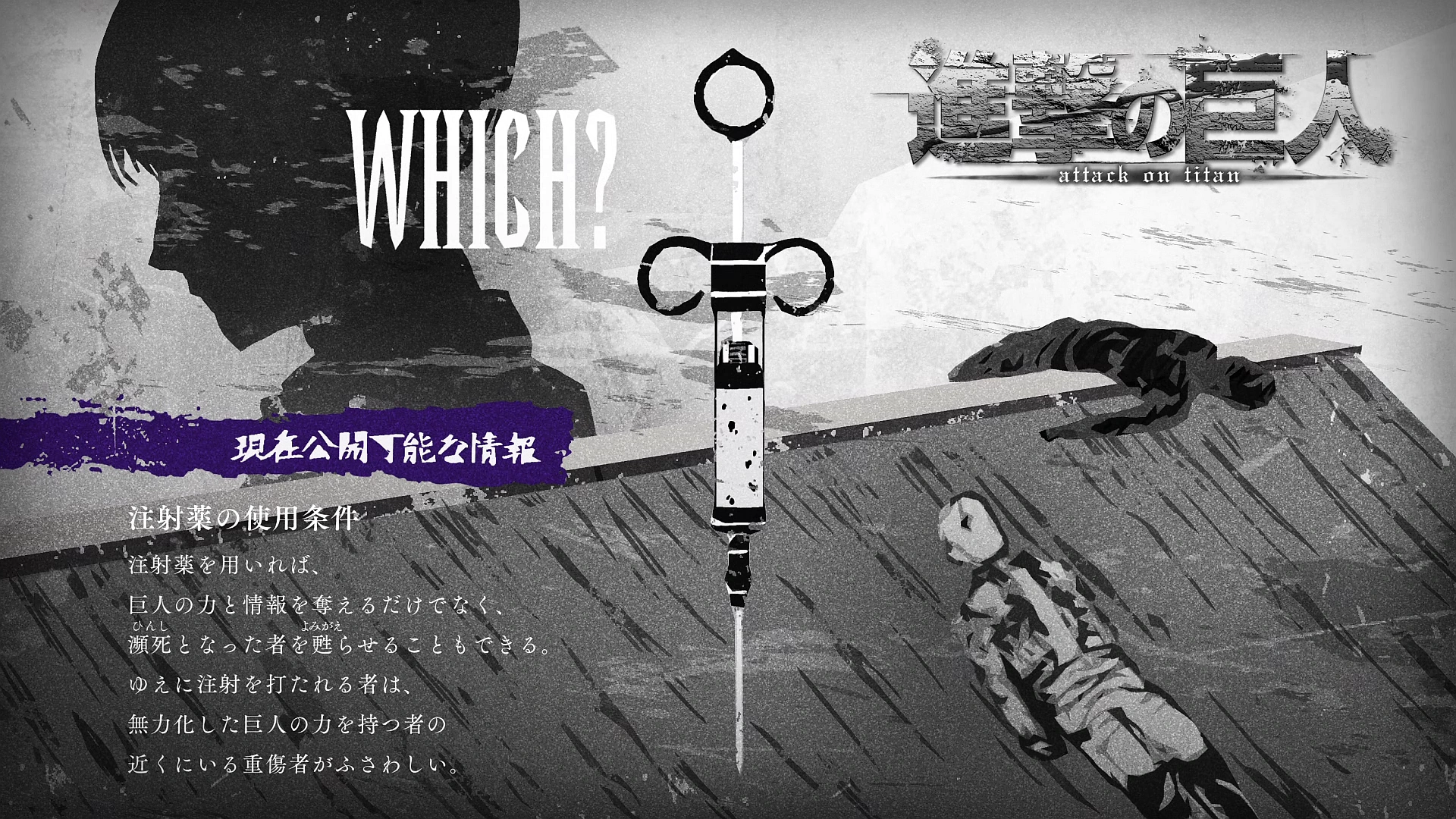 La inyección está a punto de ser entregada en las manos de Eren, pero antes de que eso ocurra, aparece Floch cargando en su espalda a Erwin, explica que el comandante ha sido gravemente herido y que piensa que la inyección podría ayudarlo. Levi aparta la inyección de Eren y va a revisar a Erwin, dándose cuenta de que aún sigue con vida y proclama que usará la inyección en Erwin. Ante aquello, Eren reacciona con horror, y con lágrimas en sus ojos le recuerda a Levi que estaba a punto de usarla en Armin, Levi responde que elige mantener con vida al hombre que salvará a la humanidad.