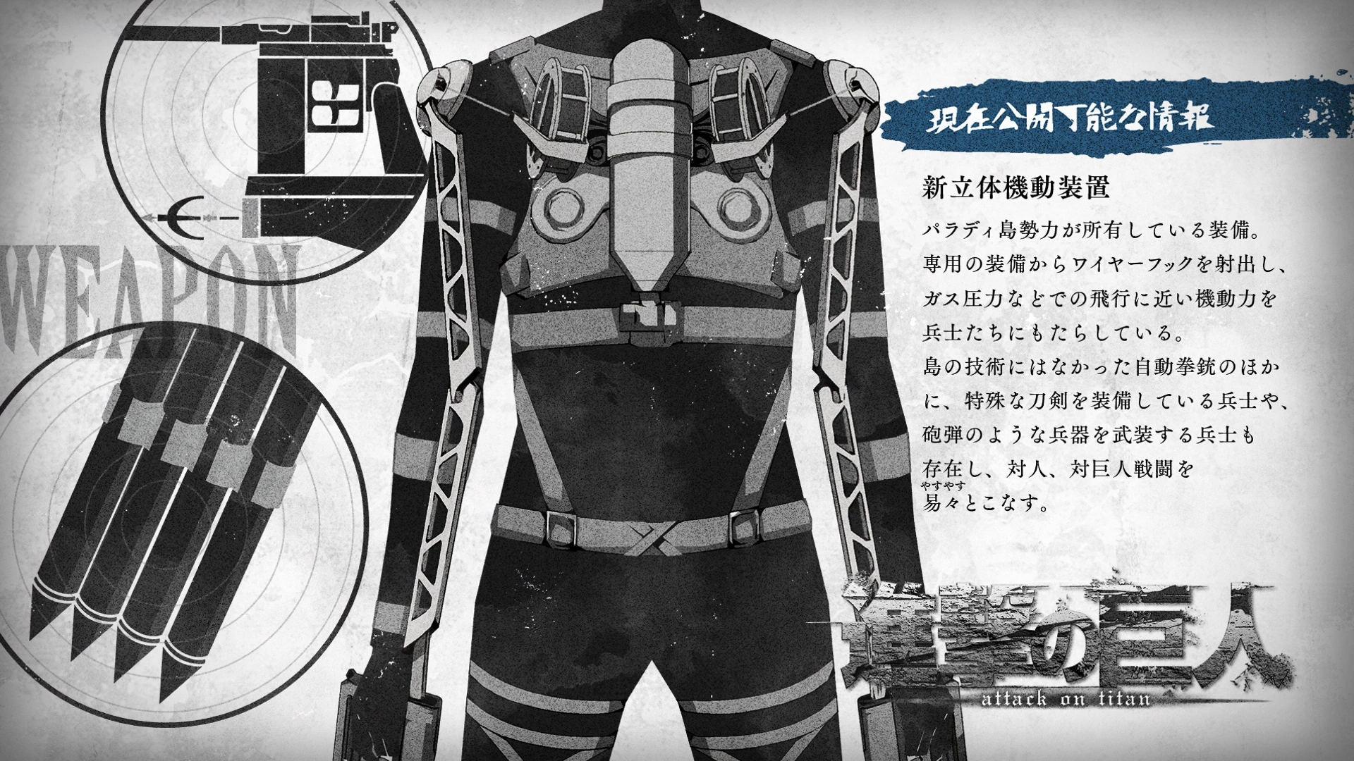 "Información Actualmente Divulgable" Nuevo Equipo de Maniobras Tridimensionales Equipo utilizado por las fuerzas de la Isla Paradis que utiliza gas comprimido y ganchos de alambre disparados desde un equipo especial, lo que permite a sus soldados moverse como si volaran. Aunque previamente no estaba disponible con la tecnología de la isla, el equipo incluye pistolas semiautomáticas, espadas especiales y algunos soldados están incluso armados con armas similares a cañones, lo que permite una mejora en combate anti-persona y anti-titán.